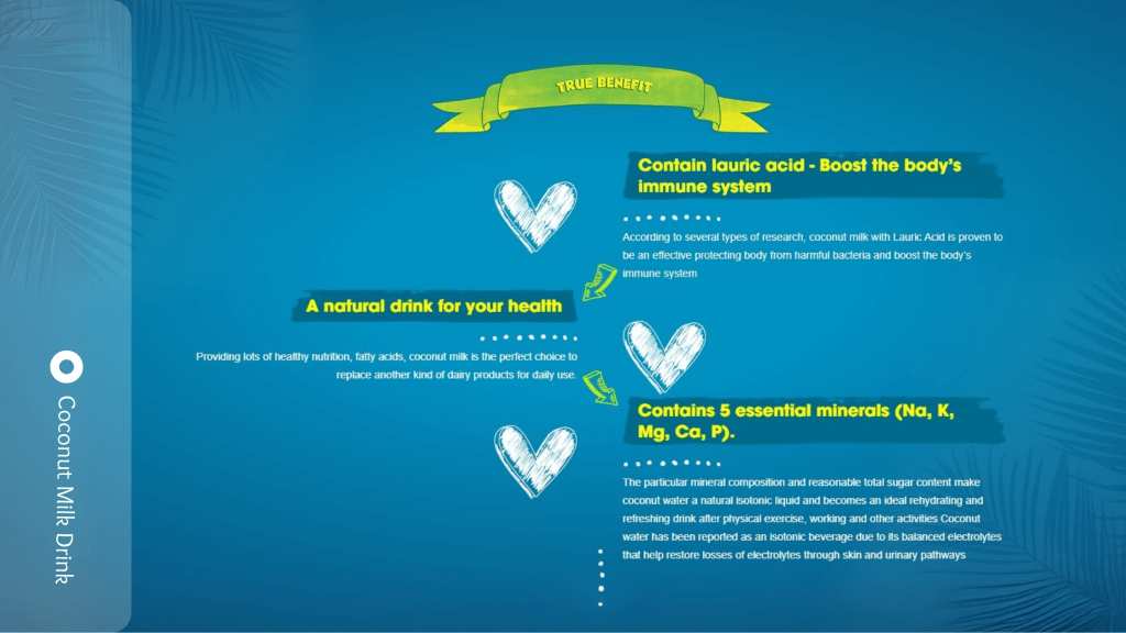 - Coconut Milk Composition Unit Calories 160kcal Tota fat 17g Sodium 15mg Total Carbohydrate 3g Sugars 2g Calcium 3mg Potassium 125mg